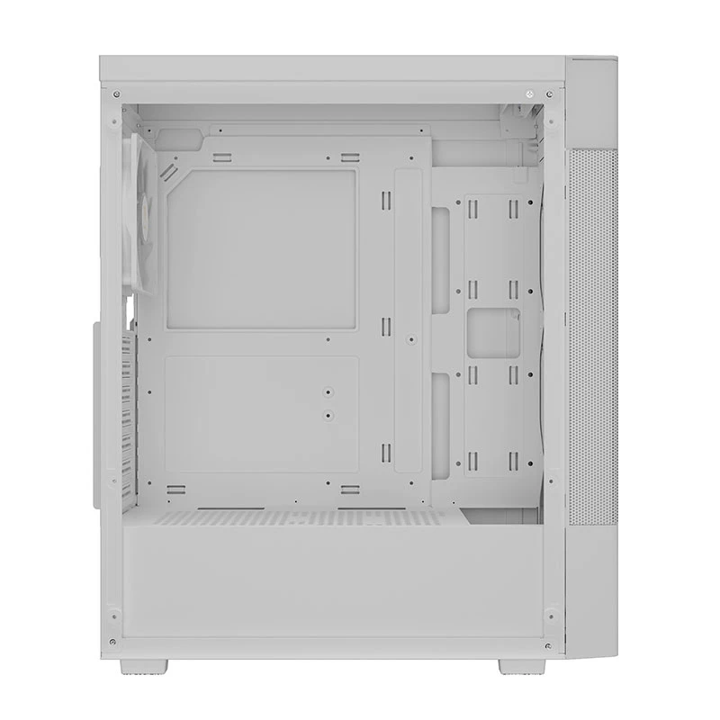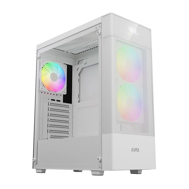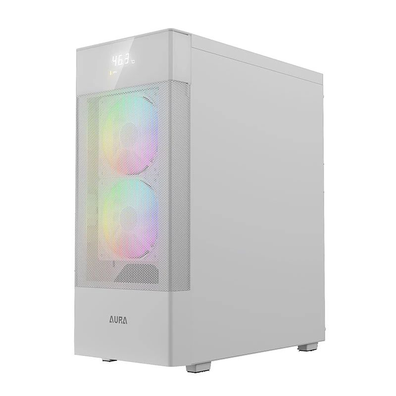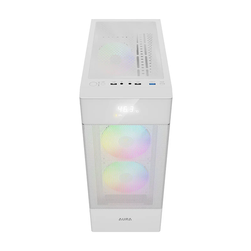 وقتی به ظاهر کیس AURA GC5 ELITE WH نگاه میکنیم، با یک بدنه سفید یکدست و مینیمال روبهرو هستیم که در کنار نورپردازی ARGB، جلوهای چشمگیر به محیط گیمینگ شما میدهد. پنل جلویی این کیس، مشبک و کاملاً نفوذپذیر طراحی شده تا عبور جریان هوا به راحتی انجام شود. اما چیزی که این طراحی را منحصربهفرد میکند، نمایشگر دیجیتال داخلی در قسمت بالایی است که بهصورت لحظهای دمای پردازنده و گرافیک و دمای محیط را نشان میدهد.