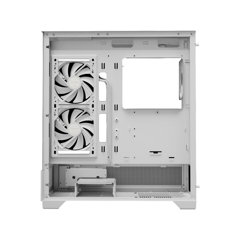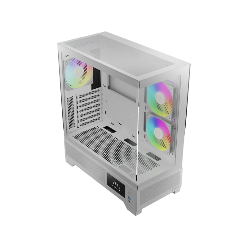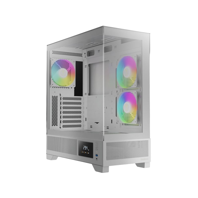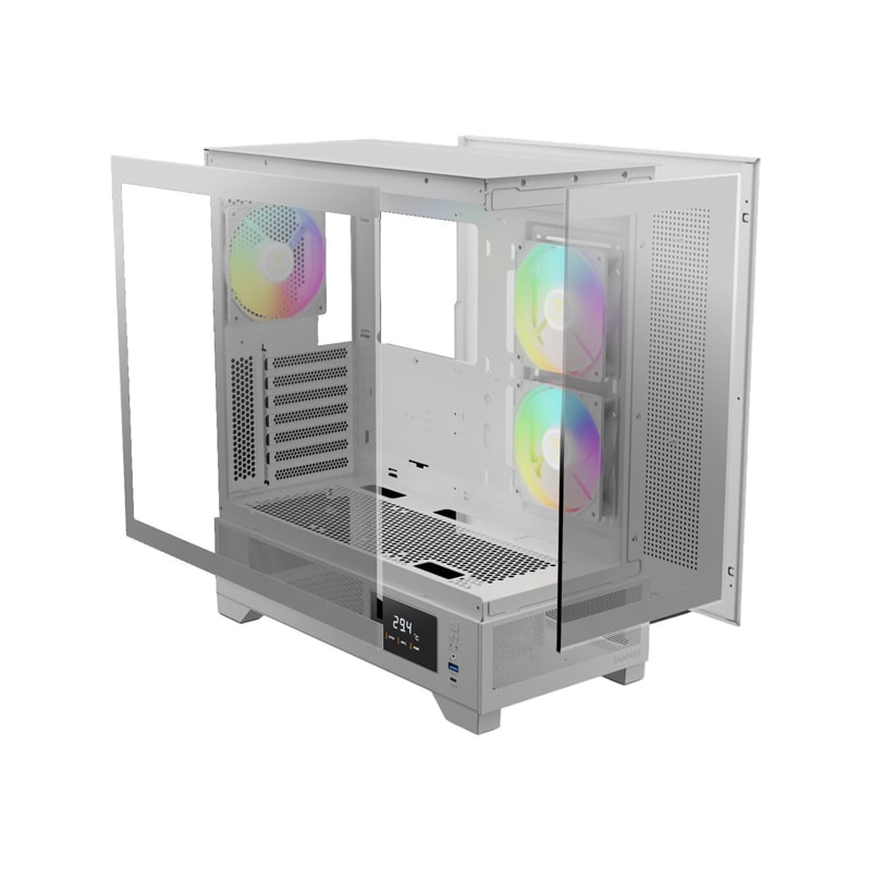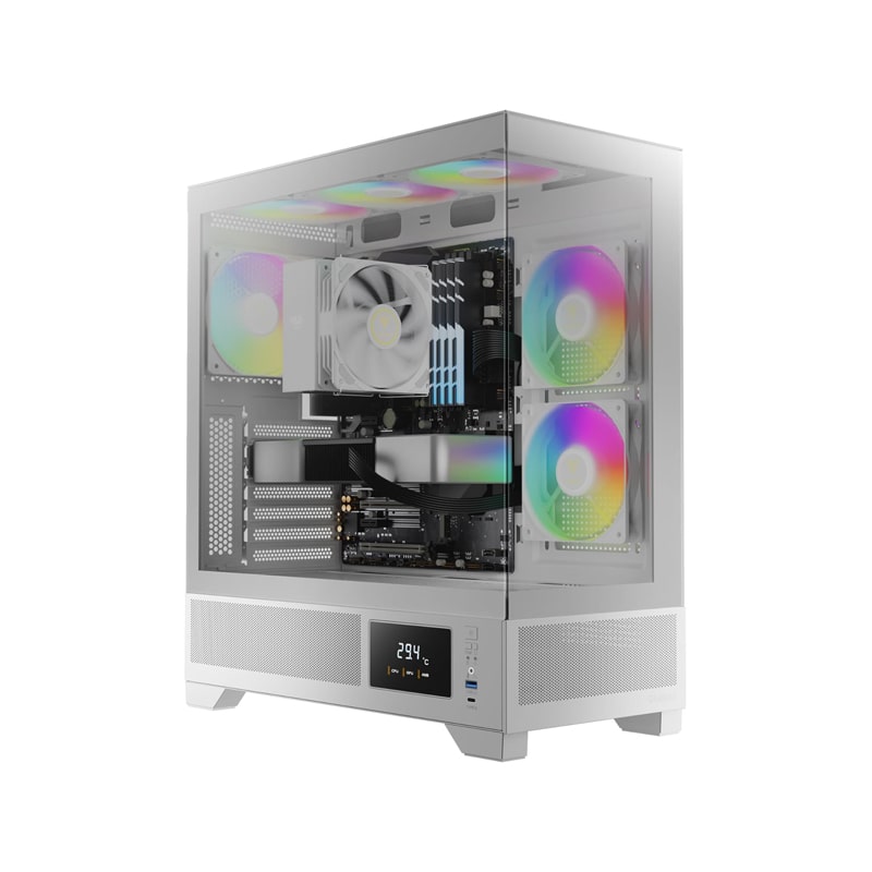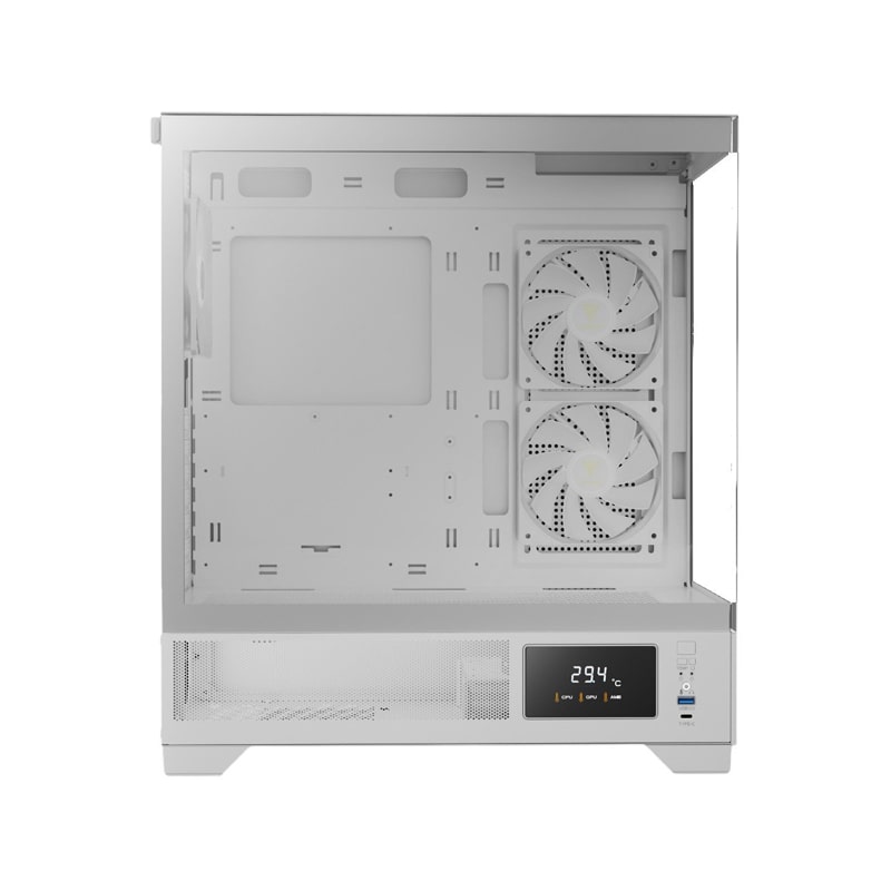 کیس کامپیوتر گیم دیاس Atlas M1 ARGB Mid Tower سفید یک کیس میانبرج (Mid Tower) گیمینگ است که با تمرکز بر طراحی مدرن، جریان هوای بهینه و ویژگیهای هوشمند مانند نمایشگر دمای CPU و GPU طراحی شده است. این کیس از پنلهای شیشهای بدون فریم (seamless tempered glass) در جلو و کنار بهره میبرد که نمای کاملی از قطعات داخلی فراهم میکند. ابعاد آن ۲۱۰ × ۴۲۰ × ۴۶۵ میلیمتر و وزن ۷٫۶ کیلوگرم است و با مادربردهای ATX، Micro-ATX و Mini-ITX سازگار میباشد. همراه با ۳ فن ۱۲۰ میلیمتری ARGB PWM پیشنصبشده (۲ فن معکوس در کنار و ۱ فن عقب)، هاب فن ۶ پورت و نمایشگر جانبی برای نمایش دما، گزینهای مناسب برای گیمرها و کاربران حرفهای در رده میانرده به شمار میرود.